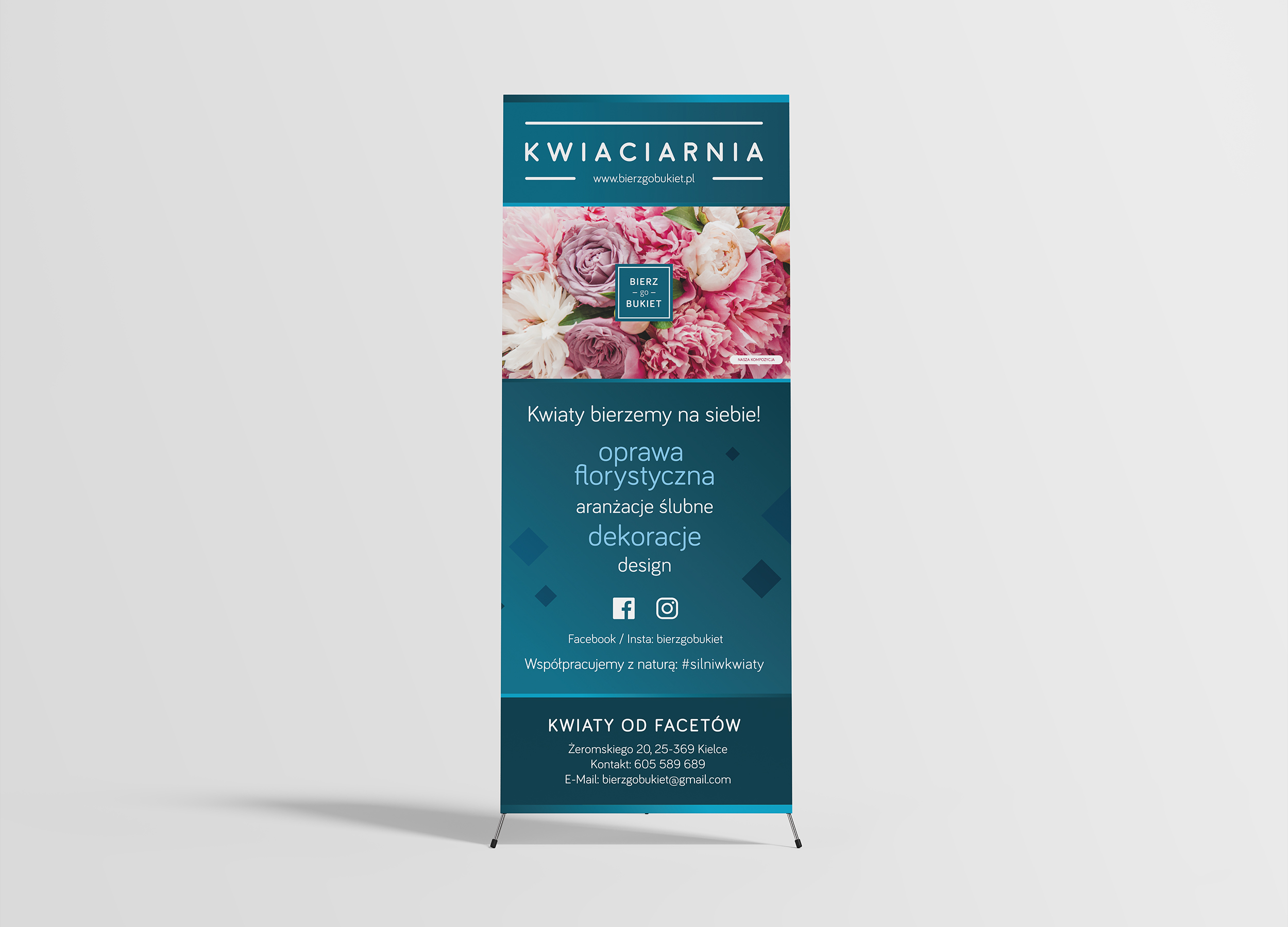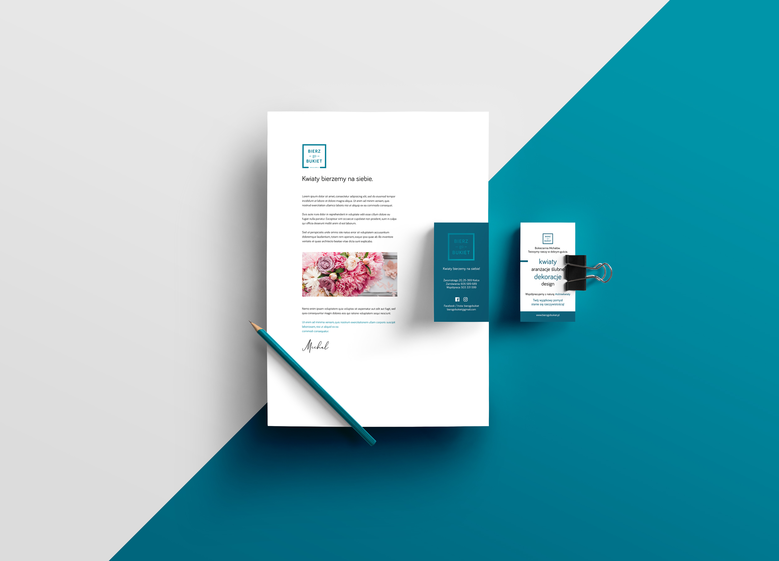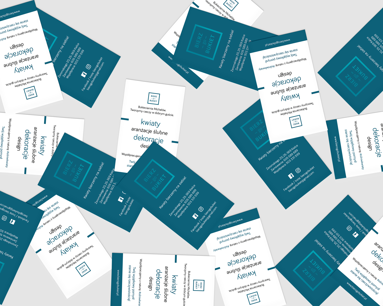 Projekt identyfikacji wizualnej przeznaczony dla kwiaciarni Bierz go Bukiet z Kielc. Unikalne logo firmy powstało według wstępnej koncepcji właściciela i doskonale wyróżniło firmę na tle konkurencji. Dalsza współpraca zaowocowała powstaniem wizytówek, papieru firmowego, stempla oraz rollupu. Wizytówki podczas realizacji zostały pokryte matowym laminatem soft touch, a na logo został naniesiony lakier UV. Dzięki temu zabiegowi zostało ono wyróżnione i pod odpowiednim kątem ładnie odbijało światło. Całość prezentowała się niezwykle efektownie.
